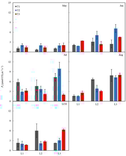 Changes in the net CO2 assimilation rate (Pn) of different periods under the temperature and photoperiod treatments. Error bars represent means ± SE (n = 3). T1 represents control; T2 represents 1.5 °C warming; T3 represents 2.0 °C warming; L1 represents 18 h photoperiod (long photoperiod), L2 represents 14 h photoperiod (control), and L3 represents 10 h photoperiod (short photoperiod).