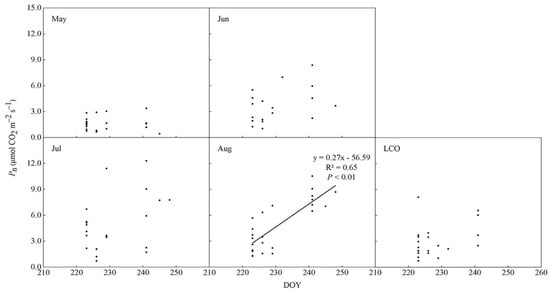 As shown, only Pn in August (near LCO) was significantly correlated with LCO (R2 = 0.65, p < 0.01) (Figure 4); therefore, the time near LCO may be the key regulating LCO variations. The photoperiod significantly changed the maximum rate of Rubisco (Vcmax) and the maximum rate of ribulose-bisphosphate regeneration (Jmax) near the time of LCO, whereas temperature and its interaction with photoperiod had no significant effect (p < 0.05, Table 3). Both leaf chlorophyll content and water content showed no significant response to photoperiod, temperature, or their interaction (Table 3).