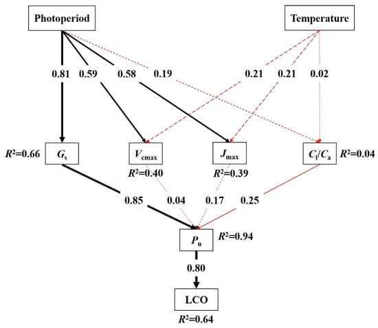 Structural equation model (SEM) analysis of the effects of photoperiod and temperature on LCO. Square boxes indicate variables in the model. Results of model fitting: χ2 = 4.00, p = 0.95, df = 10, and n = 23. Black and red arrows denote the positive and negative correlation pathways, respectively. Arrow width indicates relationship strength. Solid and dashed lines represent significant (p < 0.05) and nonsignificant (p > 0.05) pathways, respectively. The number associated with the arrow represents standardized path coefficients, and R2 values indicate the proportion of the variation explained for each dependent variable in the model.