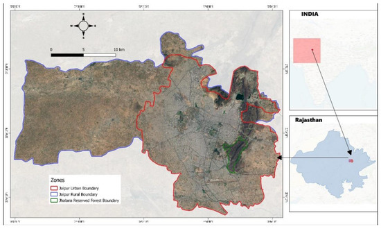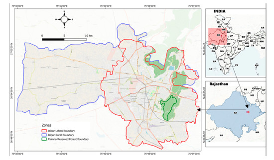 Map of the study area showing the Urban (red), Rural (blue), and Jhalana Reserve Forest (green) zones of the conurbation of Jaipur.