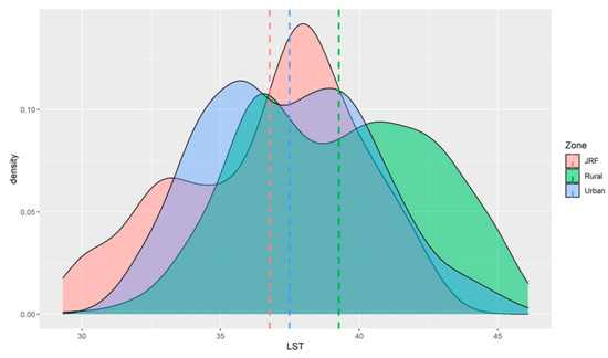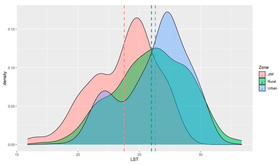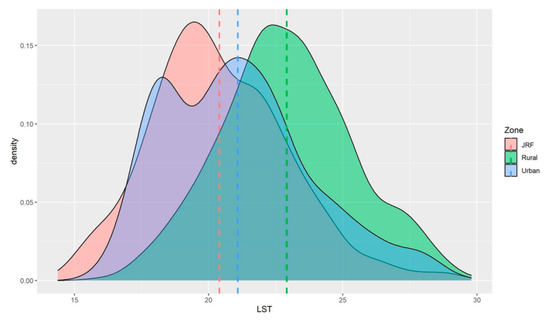 Cumulative zone-wise distribution of LSTs of the study zones was compared seasonally based on raster sampling points of all years included in the study. During the monsoon season, LSTs were highest in the urban areas (26.3 °C ± 2.6 SD), followed by the rural zone (25.9 °C ± 2.9 SD), and lowest in JRF (23.7 °C ± 2.6 SD; Figure 3).