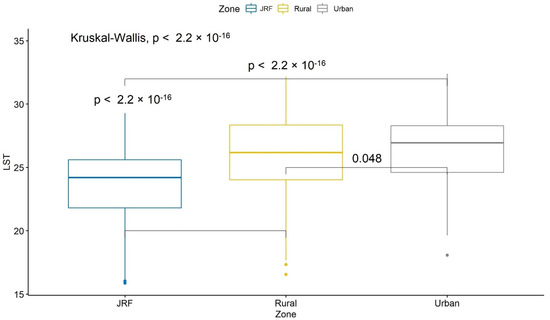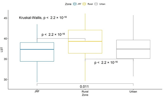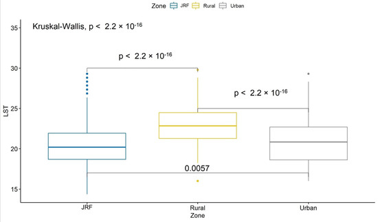 In all three seasons and zone-wise comparisons, there were highly significant differences (p < 0.01) in LSTs, except for the rural zone in the summer, where it was slightly less (p = 0.011) than the highly statistically significant difference threshold (Figure 6).