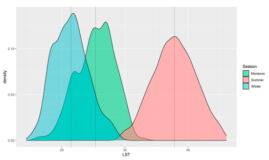 If season-wise LST distributions were considered exclusively, without zonal comparisons, it is clear that higher LSTs occur in the summer, followed by the monsoon season, and winter with significantly lower temperatures (Figure 9).