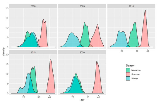 In a year-wise comparison of LSTs based on seasonal distributions, an ambiguity in LST distribution between Monsoon and Winter was observed only in the year 2000 (Figure 10).
