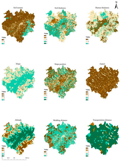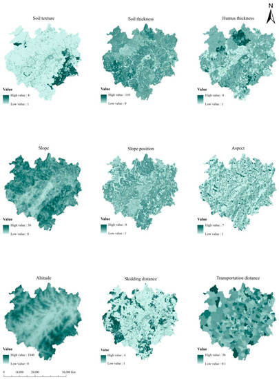 According to the survey data of forest resources planning and design in 2016, nine vector layers were extracted including the soil texture, soil thickness, humus thickness, slope, slope position, slope direction, altitude, transportation distance and skidding distance through ArcGIS software to rasterize the processing tools, and then, each index vector was rasterized as shown in Figure 2.