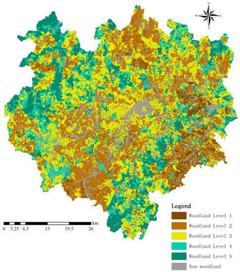The weight of each grading index in the grading unit was multiplied by its assigned value, and the scoring results of each index were summed to obtain the grading index of the grading unit. The forestland grade was divided according to the grading index. This process was completed by the ArcGIS grid calculator.