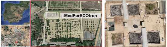 The Mediterranean Forest Ecotron (MedForECOtron) is a controlled environmental facility that lies in the Professional Forestry Practice Areas of Escuela Técnica Superior Ingenieros Agrónomos y Montes, Albacete in Spain (38°59′00″ N, 01°51′00″ W). Based on conclusions from [33], we built a mesocosm of a 4 m2 surface (2 × 2) and 1 m depth to retain some replication. Six intact lysimeters were dug in natural Aleppo pine (Pinus halepensis Mill.) forests (originally located 38°33′12″ N, 2°4′15″ W) from the SE Iberian Peninsula (Figure 1) (more details in [37]). Monoliths showed over 60% vegetation coverage on average, mostly consisting of P. halepensis Mill., Juniperus oxycedrus L., and J. phoenicea L. Other representative companion species were Genista scorpius L. DC., Rosmarinus officinalis L., or Brachypodium phoenicoides L. Roem. & Schult. Monoliths’ soil developed on limestone and was classified as Haplocalcids [41]. The soil texture was sandy loam (averaged as 66% sand, 20% silt, and 14% clay).