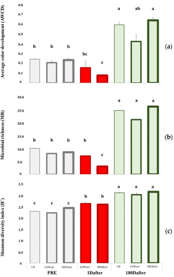Community-level physiological profiles (CLPPs) were characterized after 96 h of incubation in the midexponential growth phase in the soil samples of the burned lysimeters at MedForECOtron (14 July 2016) collected prefire (7 days before, PRE), 1 day after (1Dafter) and 6 months after (180Dafter): (a) average well-color development (AWCD); (b) microbial richness (MR); (c) the Shannon diversity index (H’). Burn severity levels: unburned (UB), low burn severity (LOWsev), and high burn severity (HIGHsev). Vertical bars represent the standard error of the mean, and lowercase letters indicate significant differences between the means of the different groups (Fisher’s least significant difference test).