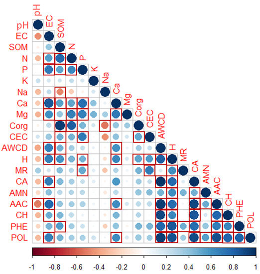 Spearman’s linear correlation analysis (Figure 4) showed that after 96 h of incubation, the average use of the CLPP substrates and the six C source groups were positively and significantly correlated and with other physico-chemical parameters. The highest correlation related AWCD to CA (+0.97), AAC (+0.94), CH (+0.91), and POL (+0.95). H’ strongly correlated with POL (+0.85) and PHE (+0.88). Other correlations appeared of SOM with Corg (+0.94), while the most important negative ones were AAC and pH (−0.51) and Corg with Na (−0.54).