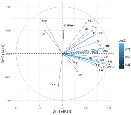 The varimax-normalized PCA was performed with the values of the six substrate groups, CLPPs, and physico-chemical values recorded from PRE (1Dafter and 180Dafter) (Figure 5). The ordination was spaced to two dimensions (eigenvalues > 1) to maximize the explained variability (59.60%) in the simplest way: 46.20% for dimension 1 (DIM1) and 13.40% for dimension 2 (DIM2). The burned soil samples clustered in relation to TIME to the CLPPs (positive values in DIM1), and mainly indices POL, ACWD, H’, and CA, which each contributed almost 10% of the total explained variability. DIM2 related BURNsev to the physico-chemical properties, mainly Na, CEC, and Sand, which, respectively, contributed 15.1%, 13.0%, and 12.7% to the total explained variability.