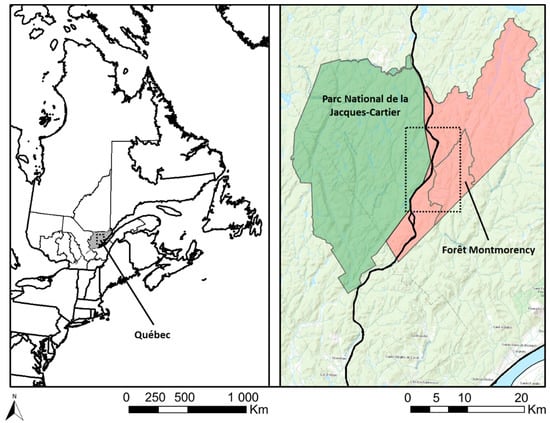 This study was carried out in the Parc national de la Jacques-Cartier (47°06′ N, 71°20′ W) and in the Forêt Montmorency (47°19′ N, 71°09′ W), both located approximately 70 km north of Quebec City (Figure 1). Both areas belong to the balsam fir-white birch bioclimatic domain within the continuous boreal forest sub-zone [20]. Balsam fir stands largely dominate the landscape; however, the black spruce (Picea mariana (Mill.) B.S.P.), white spruce (Picea glauca (Moench) Voss.), white birch (Betula papyrifera Marsh.), American mountain-ash (Sorbus americana Marsh.), and trembling aspen (Populus tremuloides Michx.) are the most common companion species in these stands.