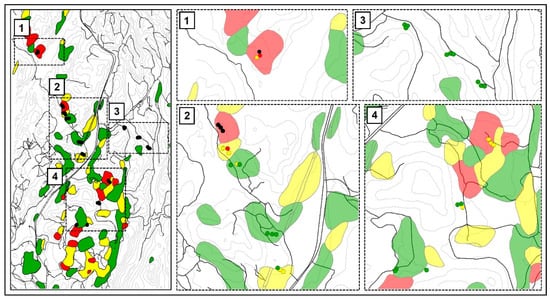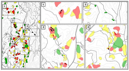 Aerial survey maps showing the hemlock looper defoliation patches in the Reserve faunique des Laurentides in Quebec, Canada, in 2013. Three severity levels are shown: light (green), moderate (yellow), and heavy (red). The black dots on the left map show the study plot locations. The colored dots on maps 1–4 show corresponding ground-level defoliation estimates (light, moderate and heavy being green, yellow, and red dots, respectively, and the black dots express the dominance of dead trees). Black stars on maps 1 and 2 express the stands in which dead trees were dominating after the 1st year of the outbreak (2012).