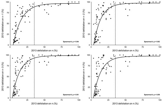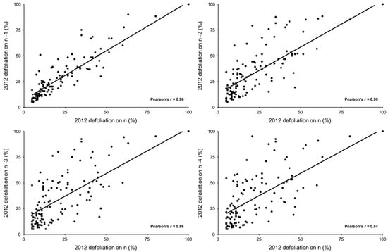 The relationships between defoliation on the current-year shoots and previous-year shoots were significant, but the strength of these relationships (Pearson’s product–moment correlation coefficient (r)) decreased slightly but progressively with shoot age, from n-1 to n-4 shoots in both years (Figure 3 and Figure 4). These relationships were positive and linear in the first year of the outbreak (Figure 3) but clearly non-linear in the second year (Figure 4). Thus, we then used Spearman’s rank correlation rho (ρ) to estimate the correlation of monotonic functions. The current-year shoots which defoliated at moderate to heavy levels were always observed on trees on which previous-year foliage was heavily or completely defoliated, while light defoliation occurred on trees affected by all levels of defoliation. However, lightly defoliated previous-year shoots were always correlated with very lightly defoliated current-year shoots (Figure 4).