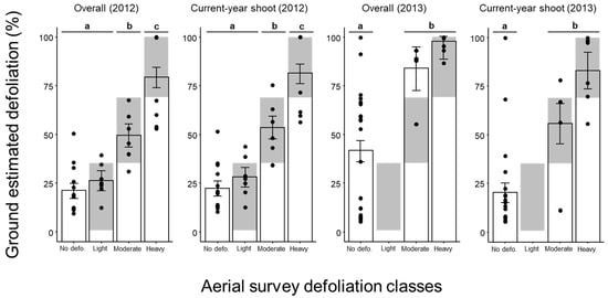 Validation of the aerial survey defoliation classes using the overall or current-year shoot defoliation estimated with the field Fettes method after the first (2012) and second (2013) year of the hemlock looper outbreak. Different letters highlight significant differences in the defoliation estimated between the ground and the aerial defoliation classes after Tukey’s pairwise comparisons. Dots represent the plot mean defoliation, and error bars represent the standard error of the mean for a given class. Gray areas represent the interval of percentage defoliation included in each MFFP class.