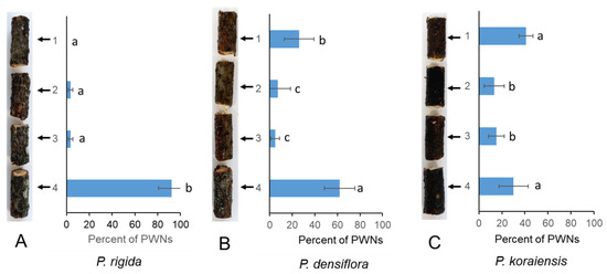 PWN migration in the stems of three Pinus species ((A) P. rigida Mill.), (B) P. densiflora (Sieb. et Zucc.), and (C) P. koraiensis (Sieb. et Zucc.) after one day of PWN inoculation. PWNs were inoculated into the small, drilled hole located at the base of the branch (number 4 portion). The experiment was repeated in triplicate. Error bars indicate the standard error of the mean (±SE) of three replicate measurements. Different letters above the bars indicate significantly different values (p < 0.05), calculated using one-way ANOVA followed by Duncan’s post hoc analysis.