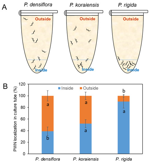Movement of PWNs inside and outside of resin from three Pinus species (P. densiflora, P. koraiensis, and P. rigida) during 3 days of culture. (A) Location of PWNs in resin or outside of resin in a PCR tube. (B) Number of PWNs located in resin (inside) or outside of resin after 3 days. Experiment was repeated in triplicate. Error bars indicate the standard error of the mean (±SE) of three replicate measurements. Different letters above the bars indicate significantly different values (p < 0.05), calculated using one-way ANOVA followed by Duncan’s post hoc analysis.