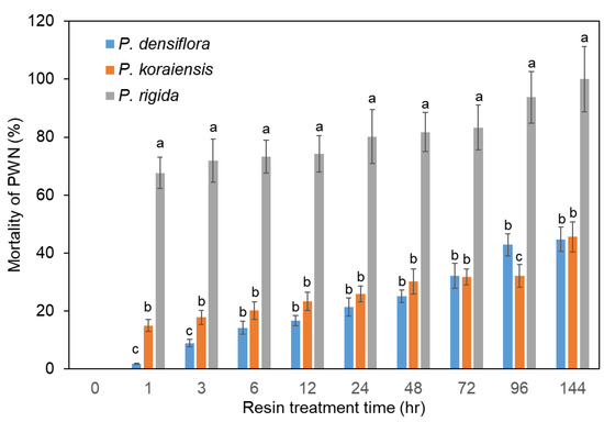 Mortality of PWNs in resin from three Pinus species. Mortality of PWNs in P. densiflora resin. Mortality of PWNs in P. koraiensis resin. Mortality of PWNs in P. rigida resin. Experiment was repeated in triplicate. Error bars indicate the standard error of the mean (±SE) of three replicate measurements. Different letters above the bars indicate significantly different values (p < 0.05), calculated using one-way ANOVA followed by Duncan’s post hoc analysis.