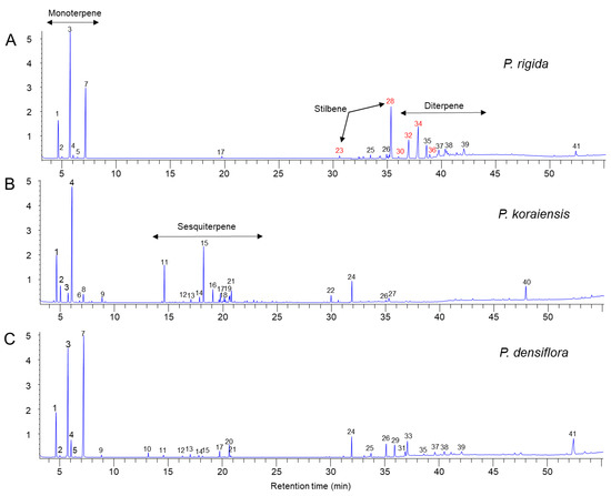 Chemical composition in resin extracts of three Pinus species (P. rigida, P. koraiensis, and P. densiflora) by GC–MS analysis. (A) GC chromatogram of P. rigida resin. (B) GC chromatogram of P. koraiensis resin. (C) GC chromatogram of P. densiflora resin.