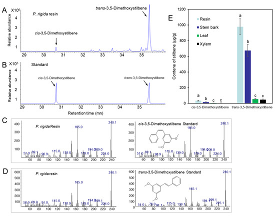 Identification of trans-3,5-dimethoxystilbene and cis-3,5-dimethoxystilbene and analysis of trans-3,5-dimethoxystilbene and cis-3,5-dimethoxystilbene content in different tissues of P. rigida plants. (A) GC chromatogram of trans-3,5-dimethoxystilbene and cis-3,5-dimethoxystilbene in resin from P. rigida. (B) GC chromatogram of standard trans-3,5-dimethoxystilbene and cis-3,5-dimethoxystilbene. (C) Mass spectra of a peak (30.58 min) detected in resin and cis-3,5-dimethoxystilbene standard. (D) Mass spectra of a peak (35.36 min) detected in resin and trans-3,5-dimethoxystilbene standard. (E) Content of trans-3,5-dimethoxystilbene and cis-3,5-dimethoxystilbene in leaf, resin, bark, and xylem. Error bars indicate the standard error of the mean (±SE) of three replicate measurements. Different letters above the bars indicate significantly different values (p < 0.05), calculated using one-way ANOVA followed by Duncan’s post hoc analysis.