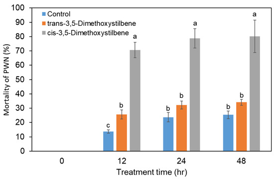 Nematicidal activity of trans-3,5-dimethoxystilbene and cis-3,5-dimethoxystilbene against Bursaphelenchus xylophilus during 48 h of treatment. Experiment was repeated in triplicate. Error bars indicate the standard error of the mean (±SE) of three replicate measurements. Different letters above the bars indicate significantly different values (p < 0.05), calculated using one-way ANOVA followed by Duncan’s post hoc analysis.