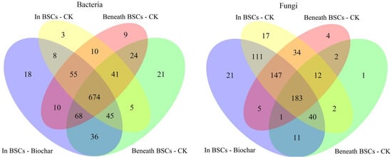 Venn diagrams showing the number of OTUs that were shared in and beneath BSCs with biochar addition.