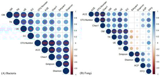 Correlation analysis showed that the bacterial diversity indices (Simpson and Shannon indices) were not significantly correlated with the soil physicochemical properties or enzyme activities. The bacterial richness was significantly correlated with soil OM content, TN content, UE activity, and SC activity (Figure 3A). The ACE and Chao1 indices of soil bacteria were significantly positively correlated with soil TN content (r = 0.631 and r = 0.643, p < 0.05), UE activity (r = 0.586 and r = 0.613, p < 0.05), OM content (r = 0.586 and r = 0.595, p < 0.05), and SC activity (r = 0.581 and r = 0.588, p < 0.05). The fungal OTU number was significantly positively correlated with soil UE activity (r = 0.828, p < 0.01), TN content (r = 0.641, p < 0.05), PPO activity (r = 0.635, p < 0.05), OM content (r = 0.624, p < 0.05), and SC activity (r = 0.583, p < 0.05) (Figure 3B). The fungal richness was affected by soil UE activity and PPO activity. The fungal ACE index was significantly positively correlated with soil UE activity (r = 0.753, p < 0.01), and the fungal Chao1 index was significantly positively correlated with soil UE activity (r = 0.805, p < 0.01) and PPO activity (r = 0.594, p < 0.05). The fungal Simpson and Shannon indices were significantly positively correlated with soil ACP activity (r = 0.578 and r = 0.579, p < 0.05).