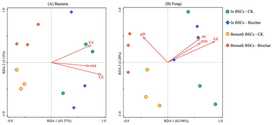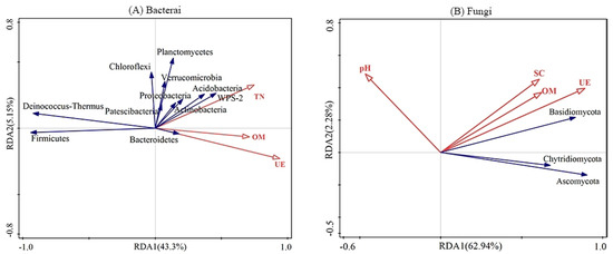 The RDA was applied to analyze the relationships between soil microbial community distributions and soil environmental factors (Figure 4). On the whole, the axes (as constrained by the measured soil environmental variables) explained 49.23% and 65.40% of the variances in the soil bacterial and fungal communities, respectively. The first two axes explained 43.37% and 5.15% of the composition of the soil bacterial community (Figure 4A) and 62.94% and 2.28% of the composition of the soil fungal community, respectively (Figure 4B). According to the Monte Carlo permutation test, the first two canonical axes were highly significant for the composition of the soil bacterial community (F = 2.60; p = 0.022) and for the composition of the soil fungal community (F = 3.30; p = 0.04). The microbial community in the soil of BSCs was significantly different from that in the soil beneath BSCs. While biochar application had only a slight influence on the soil microbial community in BSCs, it significantly changed the composition of the soil microbial community beneath BSCs. The key soil environmental factors that influenced the composition of the soil bacterial community were soil UE activity, OM content, and TN content, whereas those that affected the soil fungal community were soil UE activity, pH, OM content, and SC activity (Table 4). Among these factors, soil UE activity was the key soil environmental factor that drove bacterial and fungal communities (p < 0.01). UE activity and OM content were positively correlated with the occurrence of Bacteroidetes and Basidiomycota and negatively correlated with the occurrence of Deinococcus–Thermus and Firmicutes (Figure 5). TN content was positively correlated with the occurrence of WPS-2, Acidobacteria, Proteobacteria, and Actinobacteria. In addition, pH was negatively correlated with the occurrence of Ascomycota and Chytridiomycota.