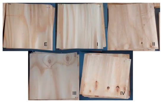 Veneer sorting by surface appearance using prescriptions from the ABNT ISO 2426-3: (E) no defects, (I) minimum defect, (II) isolated defects, (III), few defects, and (IV) several defects.