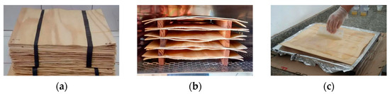 Plywoods are manufactured from veneers bonded in the direction of the grain in alternate plies usually orthogonal to each other [7]. From this well-known fundamental, wooden veneers were placed and dried in an oven at 105 ± 2 °C until they reached a moisture content of 3% to produce the panels (Figure 2b). They were visually classified and only free-defect veneers—that is, without natural knots and cracks—were selected. Four different conditions were analyzed (Table 1). Four panels were made per treatment.
