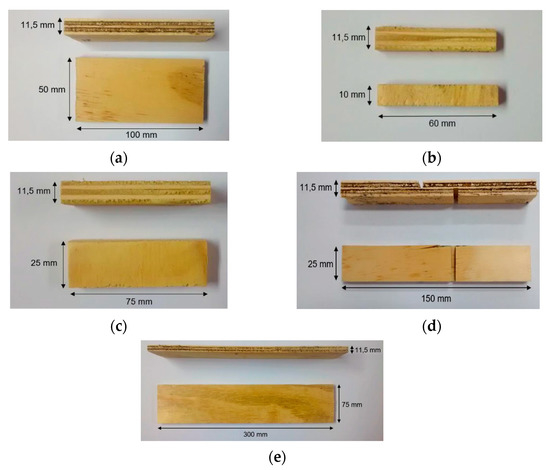 Samples’ dimensions used to characterize the panels: (a) moisture content, (b) thickness swelling, (c) water absorption, (d) glue line shear and parallel and (e) perpendicular static bending.