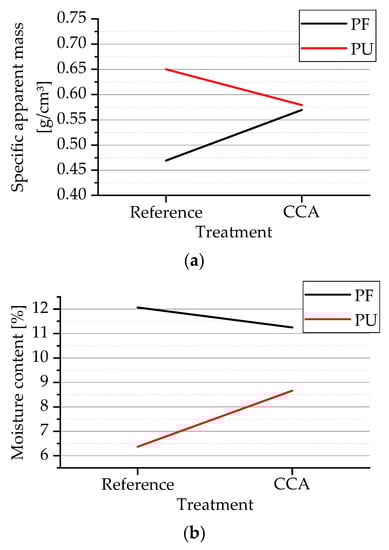 There was also no significant difference in the specific apparent mass between the control panels and with CCA in the paper of Ferreira et al. [9] and Mendes et al. [33], nor between the Pinus sylvestris panels made with PF and PU by Wilczak et al. [34], which is in line with the results obtained in this research. In the study by Setter et al. [35], the use of distinct formaldehyde-based adhesives (phenol and urea) also did not significantly affect the specific mass of the panels produced with pine veneers.