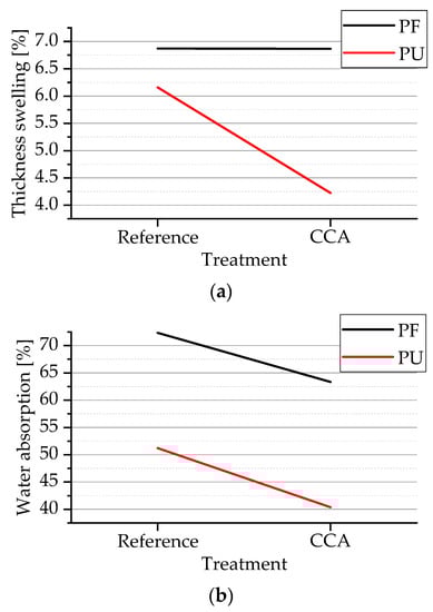 The fact that the polyurethane resin has a lower average value can also be explained by its non-polar structure being resistant to water absorption. In the study by Setter et al. [35], the use of different resins (phenol- and urea-formaldehyde) also showed a visible difference for the water absorption. According to the authors, PF adhesive is traditionally used in panels intended for outdoor use, due to its excellent resistance to moisture. Here, the results of the PF adhesive against water absorption were surpassed by the PU.