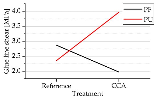 There was no significant difference between treatments (F-value = 0.4648; p-value = 0.50321 > 5%), nor between the adhesives (F-value = 2.2099; p-value = 0.15272 > 5%), as shown in Table 7. There was an interaction between the treatment and the adhesive (F-value = 6.3045; p-value = 0.02075 < 5%), as visualized in the graphic of Figure 6.
