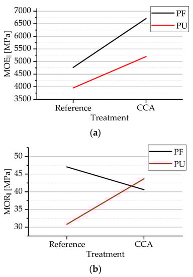 In their research, Wilczak et al. [34] reached 61.19 MPa (PF) and 63.32 MPa (PU) for MOR‖ and 7190 MPa (PF) and 6610 MPa (PU) for MOE‖. Setter et al. [35] obtained 38.92 MPa and 5520 MPa for MOR and MOE ‖, respectively, in panels with PF resin. Mendes et al. [33] reached 44.2 MPa (MOR‖) and 7071 MPa (MOE‖) in panels manufactured with CCA and 48.48 MPa (MOR‖) and 7924 MPa (MOE‖) in reference panels (both with PF).