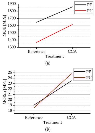 For the MOE⊥, it can be inferred that the factors involved do not change the mechanical property, despite a small increase in the mean value with the application of the treatment. As for MOR⊥, an increase in the average value was found with the CCA treatment, both for PF and PU. This effect can possibly be attributed to the better interactions of the adhesives in relation to the treated veneer.