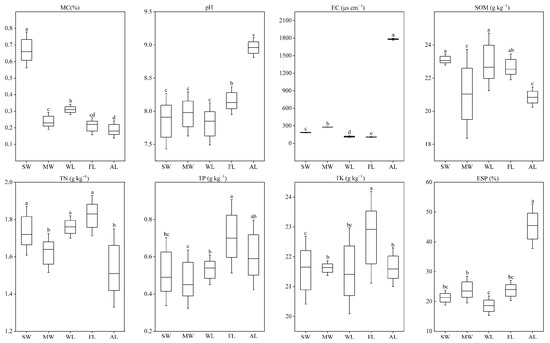 - Wang, S.; Sun, L.; Ling, N.; Zhu, C.; Chi, F.; Li, W.; Hao, X.; Zhang, W.; Bian, J.; Chen, L.; et al. Exploring soil factors determining composition and structure of the bacterial communities in saline-alkali soils of Songnen Plain. Front. Microbiol. 2020, 10, 2902. [Google Scholar] [CrossRef] [Green Version]
