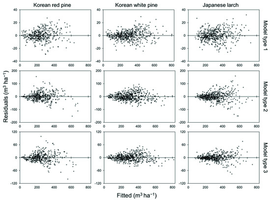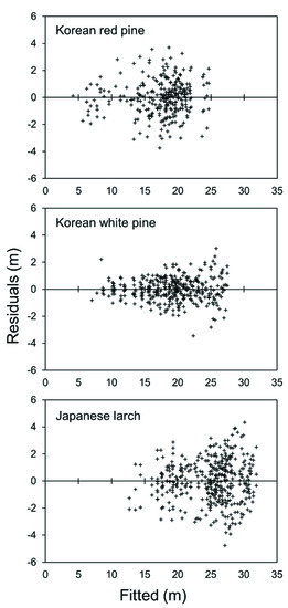 All the other residuals are provided in the Supplementary Files. When the predicted values were calculated from the logarithmic scale to the arithmetic scale, we corrected the residuals by adding the variance of the error term [13,63]. The developed site index models were displayed with the observations and the site index curves, and the suitability was checked. Based on our research findings on the major site index range by species, the yield model simulations were illustrated and compared by species, as an example, to examine the effect of the site index and the stand density as the stand age increases. The variable-density yield model outputs were compared with the results from other studies to assess their reliability.