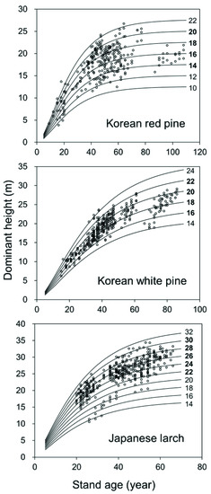 This was considered suitable taking into account the final felling age currently being implemented in Korea. The final felling age is 60, 70, and 50 for the Korean red pine, the Korean white pine, and the Japanese larch, respectively, in national forests and 40, 50, and 30, respectively, by species, in private forests [64]. The average age by species was between 40 and 50 according to our modeling data (Table 1). Our data also presented continuing vigorous dominant height growth at age 30, and it remained relatively stable after the age of at least 40–50 years (Figure 3). Therefore, considering these perspectives, our results support the concept of a base age of 40 years in this study.