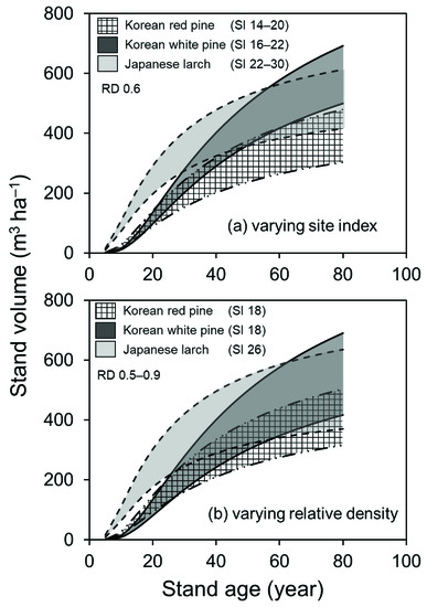 In the results presented in Figure 4a, the stand volume increased the fastest in the Japanese larch stand, but it later yielded results similar to those of the Korean white pine stand. Also, the stand volume was the lowest in the Korean red pine stand. In the result shown in Figure 4b, the stand volume was generally highest in the Japanese larch stand at an early stage, but the Korean white pine stand attained a similar stand volume after a stand age of 60 years was reached. The lowest stand volume was recorded in the Korean red pine stand. In Figure 4a, the minimum and maximum stand volume ranged between 210–332 m3 ha−1 for the Korean red pine, 316–438 m3 ha−1 for the Korean white pine, and 311–458 m3 ha−1 for the Japanese larch at 50 years of age. Similarly, in Figure 4b, the stand volume ranged between 247–394 m3 ha−1, 301–499 m3 ha−1, and 320–548 m3 ha−1 by species. This comparison indicates a greater difference in the stand volume derived from the stand density.