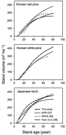 The models developed in this study were available for stand yield prediction from young to mature stands using three types of stand density variables (Table 4). However, it is important to apply caution in predictions for stands younger than 15 years because the age range was not included in the modeling due to an insufficient number of samples and a biased fit. The monoculture of the Korean red pine, the Korean white pine, and the Japanese larch was targeted, especially those grown in the region of Gangwon and the North Gyeongsang provinces, contrary to previous studies [37,38,49] which targeted the whole region of Korea. The different amounts of stand volume were substantiated in line with the specific regions and their data between our study and previous studies [37,38,49]. Therefore, the models developed in this study will be more accurate when applied within the stands of these targeted regions or provinces.