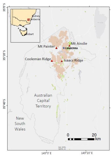 In the Australian Capital Territory (ACT), the species occupies a naturally occurring niche on dry, stony ridges and low hills [] to about 900 m above sea level (asl) [,]. Canberra is in many ways a unique city, developed only 100 years ago, with strict planning rules that exclude the intensive development of the many hills that rise from 100–200 m (700–800 m asl) above the urban areas of the city, which is situated at around 600 m asl. Before the city was developed, the study area was a pastoral district, having been opened up for grazing from the 1820s onwards, with extensive clearing and grazing in the lowland areas that are now suburban sites. The autecology and successional processes of A. verticillata on the hills of the ACT were studied in detail by Hueneke []. The interaction of various factors, including grazing, clearing for pastoral activity and rabbit control, fire and mechanical disturbances, such as track building associated with infrastructure development including radio mast installations on the hills, has resulted in conditions favorable to the spread and stand development of A. verticillata on some of the hills, including Mt. Stromlo and the range formed by Mt. Ainslie and Mt Majura. The species thrives in disturbed areas that are exposed to full sun with thin, stony soils, and the species is serotinous []. Intense fire in 1952 on the slopes of Mt. Stromlo led to reduced competition from other plants and created ideal conditions for the A. verticillata seedling regeneration, leading to very dense stands of the species that are still extant in 2020, following another major fire in 2003. In contrast to the fragmentation of the stands described by Broadhurst [,], Hueneke [] concluded that A. verticillata has become, or is likely to become, more dominant on hillslopes in the ACT, due to a combination of anthropogenic disturbance and the areas being increasingly protected but heavily used for recreational purposes, due to their peri-urban position in the midst of a city. Despite this difference, stands in the ACT are nevertheless strongly, naturally disjunct, as the species does not spread to the plains between ridges and hills, formerly because it was outcompeted by other taxa including eucalypts, and more latterly because of urban development.