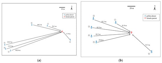 Distances and relative positions between pollen donors and the single female parent at Cooleman Ridge, ACT. (a) Distances and relative positions between pollen donors and the single female parent at Cooleman Ridge, ACT. Pollen donor ①, ②, ③, ④, ⑤, ⑥ sired 6, 12, 1, 20, 8 and 1 offspring (greenhouse-raised, open-pollinated seedlings), respectively; (b) Distances and relative positions between pollen donors and the single female parent at Mt. Painter, ACT. Pollen donor ①, ②, ③, ④, ⑤, ⑥ sired 8, 1, 5, 1, 15 and 4 offspring (greenhouse-raised open-pollinated seedlings), respectively.