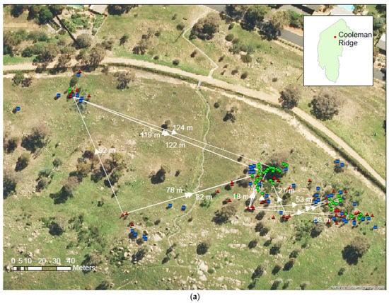 (a) Population of A. verticillata at Cooleman Ridge with an indicative selection of mothers and their progeny linked by vector traces (adult females, red triangles; adult males, blue squares; field-grown seedlings, green circles). (b) Population of A. verticillata at Mt. Painter with an indicative selection of mothers and their progeny linked by vector traces (adult females, red triangles; adult males, blue squares; adults of indeterminate sex, white circles; field-grown seedlings, green circles). Arrow heads indicate the inferred direction of seed dispersal.