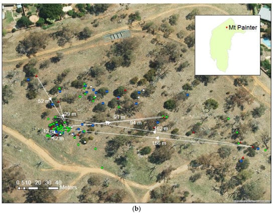 Considerable relatedness among the parents was indicated at Mt. Painter. Three of the adult females formed a genet with 2θ = 1, and two other adult females were very closely related with 2θ = 0.87. Numerous likely HS and full-sib relationships (the latter could also possibly be PO relationships) were also identified among the female parents. Eighteen female trees were identified as mother trees for 22 out of 55 offspring seedlings, with the maternal parents of 33 seedlings not identified from within- and among-population female trees. While not all of the mothers were identifiable using the available marker panel, all of the Mt. Painter individuals had some level of close relatedness to at least one female parent. This could be explained by (i) the female parent being no longer present but other relatives of the parent remaining; (ii) the marker panel lacking sufficient information for the accurate assignation of parentage. The result, therefore, does not present strong evidence that the seeds were transported to Mt. Painter from another site. The distances between the offspring and mother trees ranged from 2 to 165 m, with an average of 40 m at Mt. Painter (Table 5). However, unlike pollen flow, there was no strong trend in the direction of seed fall at Mt. Painter, with many progenies located in a large clump (Figure 3b).