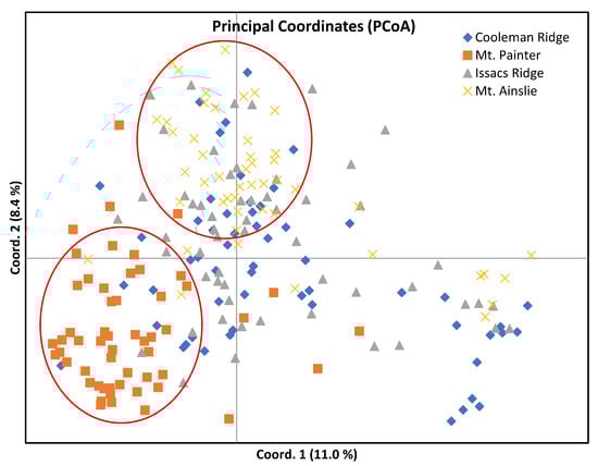 The analysis of the genetic structure of seedlings among the four populations showed that the pairwise population genetic differentiation (FST) values ranged from 0.057 (Isaacs Ridge vs. Mt. Ainslie) to 0.165 (Mt. Painter vs. Mt. Ainslie) (Table 6), suggesting a moderate to high degree of genetic differentiation among the four populations, according to the suggested criterion of low (FST < 0.05), moderate (0.05 < FST < 0.15), high (FST > 0.15) [,]. Meanwhile, the pairwise population gene flow (Nm) ranged from 1.336 (Mt. Painter vs. Mt. Ainslie) to 4.378 (Isaacs Ridge vs. Mt. Ainslie) and showed an obviously negative correlation with the FST values. The AMOVA revealed that only a small proportion of the genetic variation (8%) was partitioned among the four populations and most of the genetic variation (92%) was generated within the populations (Table 7). The Principal Coordinate Analysis (PCoA) (Figure 4) revealed that the first two axes in the analysis accounted for 19.4% (11.0% and 8.4%, respectively) of the total variation, with considerable overlap of individuals among the populations of Cooleman Ridge, Isaacs Ridge and Mt. Ainslie, while individuals from the Mt. Painter subpopulation exhibited stronger clustering.
