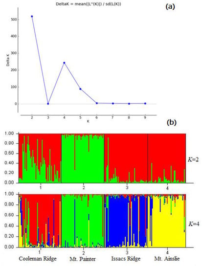 The Bayesian clustering analysis, performed in STRUCTURE software and Structure Harvester software, provides additional support for the determination of genetic structure and optimal K value. The log-likelihood of the number of clusters suggested that the optimal K value was two (corresponding to the populations mostly comprising (i) Mt. Painter individuals and (ii) the others), but a marked secondary peak in delta K = 4 was found (Figure 5), consistent with the four sampling locations.