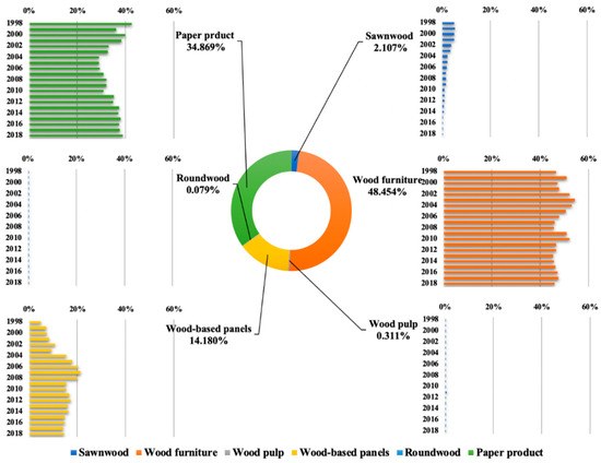 The proportion of the export value of wood forest products of China. Source: calculated according to the data of the United Nations UNCOMTRADE database (the percentage of the pie chart in the middle of Figure 1 represents an average export percentage between 1998 to 2018).
