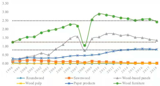 In addition, for paper products, although the export competitiveness showed an increase from 1998 to 2018, the competitiveness was always weak. The RCA index from 1998 to 2014 was less than 0.8, which was in a quite weak competitive position. From 2014 to 2018, the RCA index becomes slightly higher than 0.8, and the competitiveness is less weak. For other wood forest products, from 1998 to 2018, the RCA indexes of sawnwood, roundwood, and wood pulp were all below 0.8 in each year. Those export products were always in a very weak position in international competition, and the export competitiveness of sawnwood showed a clear decrease.