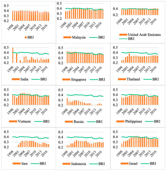 Then, we put the focus on the quality of Chinese wooden furniture in the area of the “Belt and Road Initiative”, to analyze its regional distribution characteristics. The quality of wooden furniture exported to the “Belt and Road Initiative” countries during 1998 to 2017 was relatively stable, while the quality declined slightly from 2012 to 2017 (see Figure 4). Specifically, the quality level was the highest in 2002, with a quality value of 0.407, whereas in 2013, the quality level was the lowest with a quality value of 0.369. Then, the top major markets were selected in terms of export value and conduct research by country. First of all, it analyzes the characteristics of the quality change trend, according to the three types of quality level rising, quality level falling, and quality change without a specific trend. The first type is that the quality level was rising. In terms of different countries, the qualities of wooden furniture exported to Malaysia, Thailand, Indonesia, and Israel were on the rise. Among them, the qualities of wooden furniture to Malaysia and Israel were relatively high. In particular, the quality of wooden furniture exported to Malaysia rose from 0.344 in 1998 to 0.390 in 2017, with an increase of 13.37%. The quality of wooden furniture to Israel increased from 0.270 in 1998 to 0.358 in 2017, having a significant increase of 32.59%. In contrast, the qualities of wooden furniture exported to Thailand and Indonesia were relatively low, and each year were lower than the overall quality level of “Belt and Road Initiative” countries. However, their qualities increased significantly. To be specific, the quality of wooden furniture to Thailand increased by 33.73%, and the quality of wooden furniture exported to Indonesia rose by 23.14%. The second type is that the quality level was falling. Furthermore, the qualities of wooden furniture exported to Singapore and Russia were showing a downward trend. Specifically, the quality of wooden furniture to Singapore was roughly the same as the overall quality of the “Belt and Road Initiative” countries, but with a slight decline. The quality value dropped from 0.426 in 1998 to 0.369 in 2017. In particular, the quality of wooden furniture exported to Russia fell sharply, and each year was lower than the overall quality level of the “Belt and Road Initiative” countries; moreover, the quality level was extremely low. The quality value dropped from 0.341 in 1998 to 0.201 in 2017. The third type is that the quality changed without a specific trend. In contrast, the qualities of wooden furniture exported to the United Arab Emirates, India, Vietnam, the Philippines, and Iran had no obvious trend of change. To be specific, the qualities of wooden furniture to the United Arab Emirates, Vietnam, and the Philippines fluctuated around the overall quality of the “Belt and Road Initiative” countries; however, the quality level is relatively high. On the contrary, the quality level of wooden furniture exported to India and Iran fluctuated constantly, and the quality level is low.