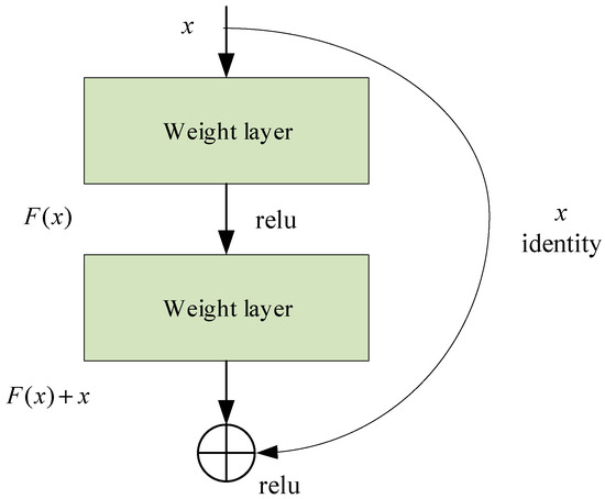 Following the success of VGGNet architectures [29], researchers believe that deeper models outperform shallower models. However, as the number of model layers increases, the complexity and training difficulty of the model also increases, and the accuracy decreases. In 2016, Kaiming He and colleagues at Microsoft Research solved the problem of gradient disappearance and gradient explosion by building ResNet, making feasible deeper network training. They introduced a new learning framework to simplify the training of deeper networks [30], and called the framework residual learning; accordingly, the model using this framework is called residual network (ResNet). ResNet allows original input information to be directly connected to subsequent neurons, and takes as its goal minimization of the difference (residual) between input and output. Specifically, the original input to the network is set to x and the final desired output is set to . When the original input is passed directly to the tail of the network as the initial result, the objective to be learned in this case becomes . Figure 3 illustrates the principle of residual learning in ResNet.